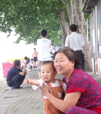 This particular photo was taken in Wuhan beside Wuhan University, at a place where many people go swimming in a lake beside the Yangtze River. In Chinese, the Yangtze is called the "Chang Jiang" ("chawng jeeawng") which means "Long River". As with many lakes in Chinese cities, this one has a well-used strolling path along the side of it, where this Chinese grandmother was having some fun with her grandson.